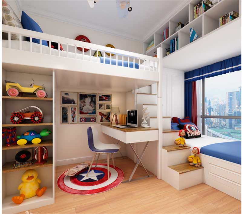高低床的設(shè)計還能夠在兒童房的有限空間中,創(chuàng)造出足夠多的收納空間,兒童天性好玩,有了足夠的收納柜后,物品玩具輕松收納,空間更加美觀整潔。