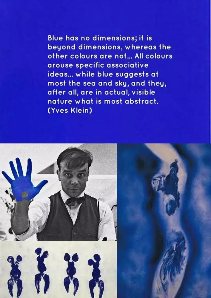 伊夫·克萊因在米蘭畫展上展出了八幅同樣大小、涂滿近似群青色顏料的畫板,于此,“克萊因藍”正式亮相于世人眼前,這種色彩被正式命名為“國際克萊因藍”。萊因對色彩有了新的定義:每種顏色都表現了一個活生生的世界,我想要在我的繪畫中表現這些世界。
