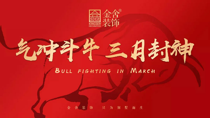 “氣沖斗牛,三月封神。”金舍裝飾三月奮戰季正式啟動了,每年的三月都是家裝最旺之時。榮耀三月,收獲成功,在這個奮斗的季節里,希望各位金舍家人都用自己的行動、汗水和付出,收獲屬于自己的成功與夢想。