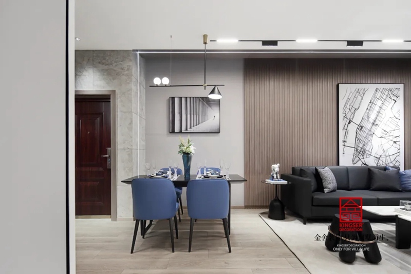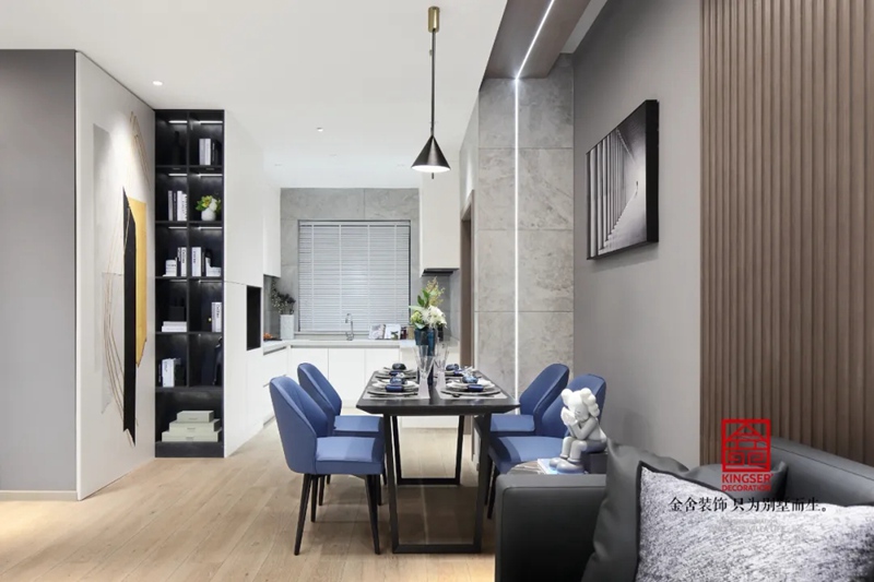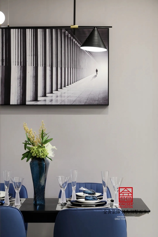 餐廳中運用灰藍色色調,無需過多裝飾,簡約才是生活本味。整體的空間較小,能滿足基本的功能。在方寸間也能表現出一種舒適的感覺。