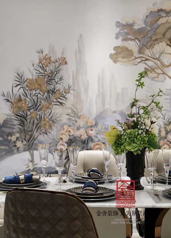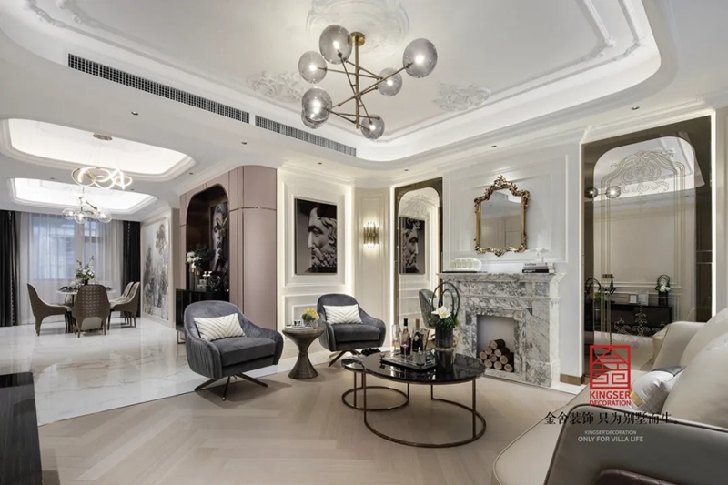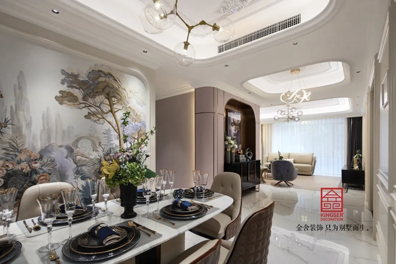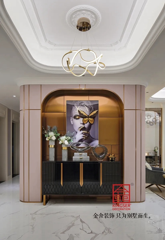 此案例為石家莊金舍裝飾-唐宮原著樣板間168平米裝修實(shí)景。以都市精英追求物質(zhì)生活的豐富多彩,又對(duì)自然藝術(shù)品位有極高的要求為出發(fā)點(diǎn),將現(xiàn)代輕奢的設(shè)計(jì)與時(shí)尚格調(diào)相融合,作為家庭日常生活主要活動(dòng)的共有空間,韻律是潛心醞釀的順理成章,而品味則是空間里的無名英雄。以現(xiàn)代視野做基調(diào),在百折千回的婉轉(zhuǎn)中獲取靈感,藏巧在空間中,隱思于時(shí)間里。