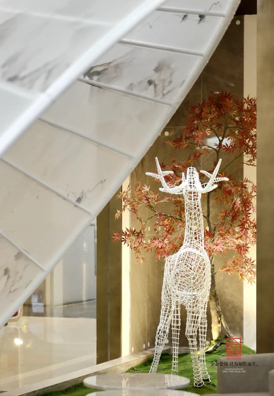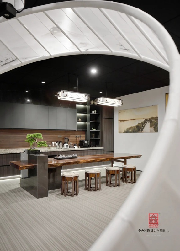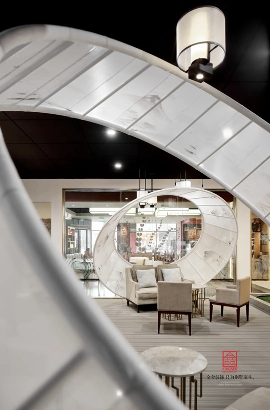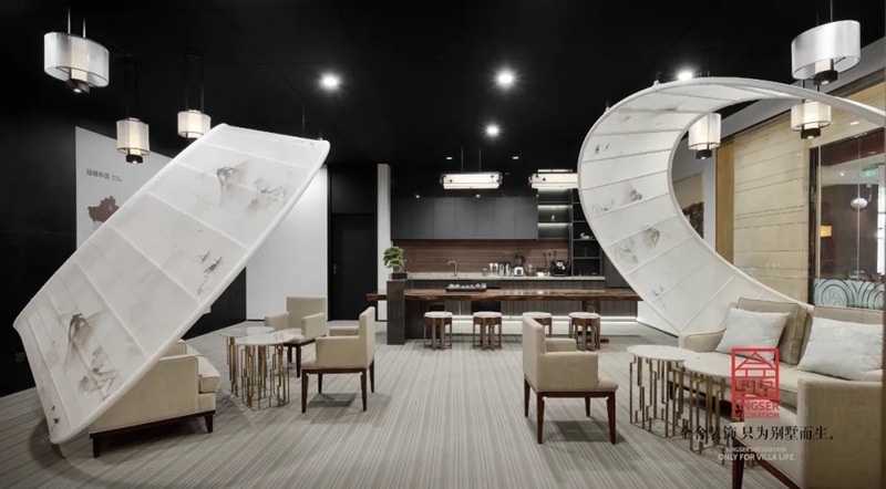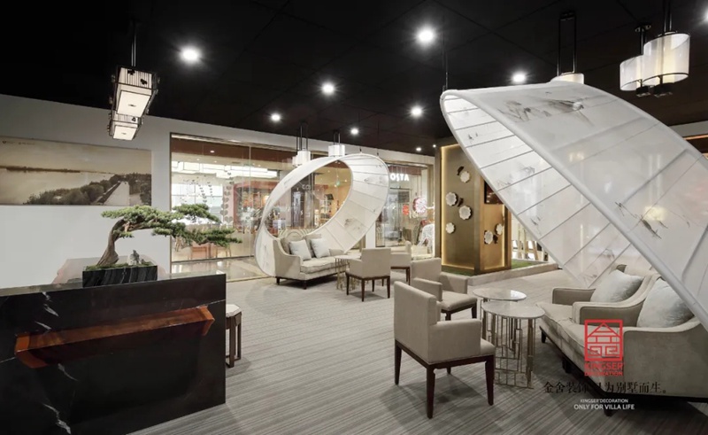 -御河上院在商場的樓盤展示區裝修實景,在設計中將自然與人文的意象融入室內設計,綠意盎然的自然景象以其深厚的文化底蘊滋潤著人們的心靈,對自然的認識和感悟,讓人豁然開朗,心曠神怡,也就成為中國傳統文化資產的傳承、轉譯與新生 。