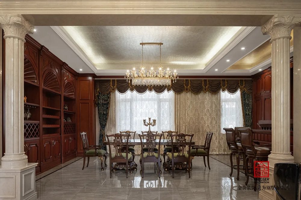 不同空間有著不同的設計效果,一樓的客廳是中式客廳和西式客廳,中式餐廳和西式餐廳,不同的空間處理成不同的效果,增加空間的實用性和整體的空間風格界定。