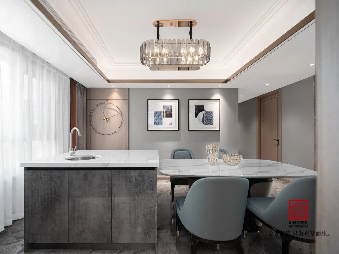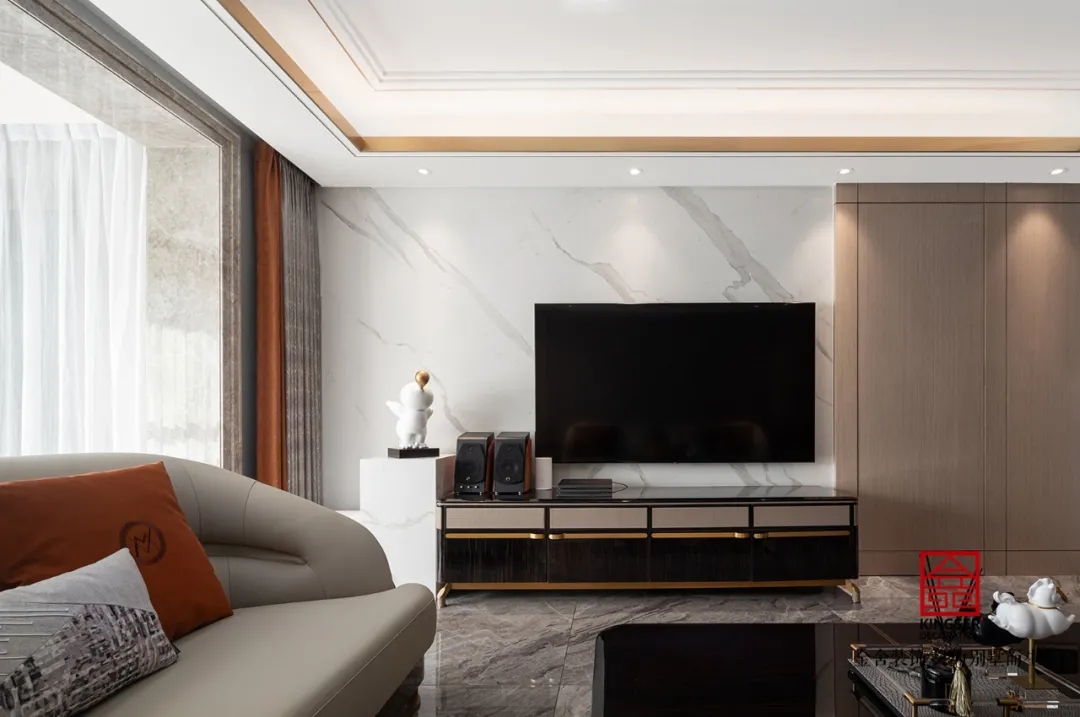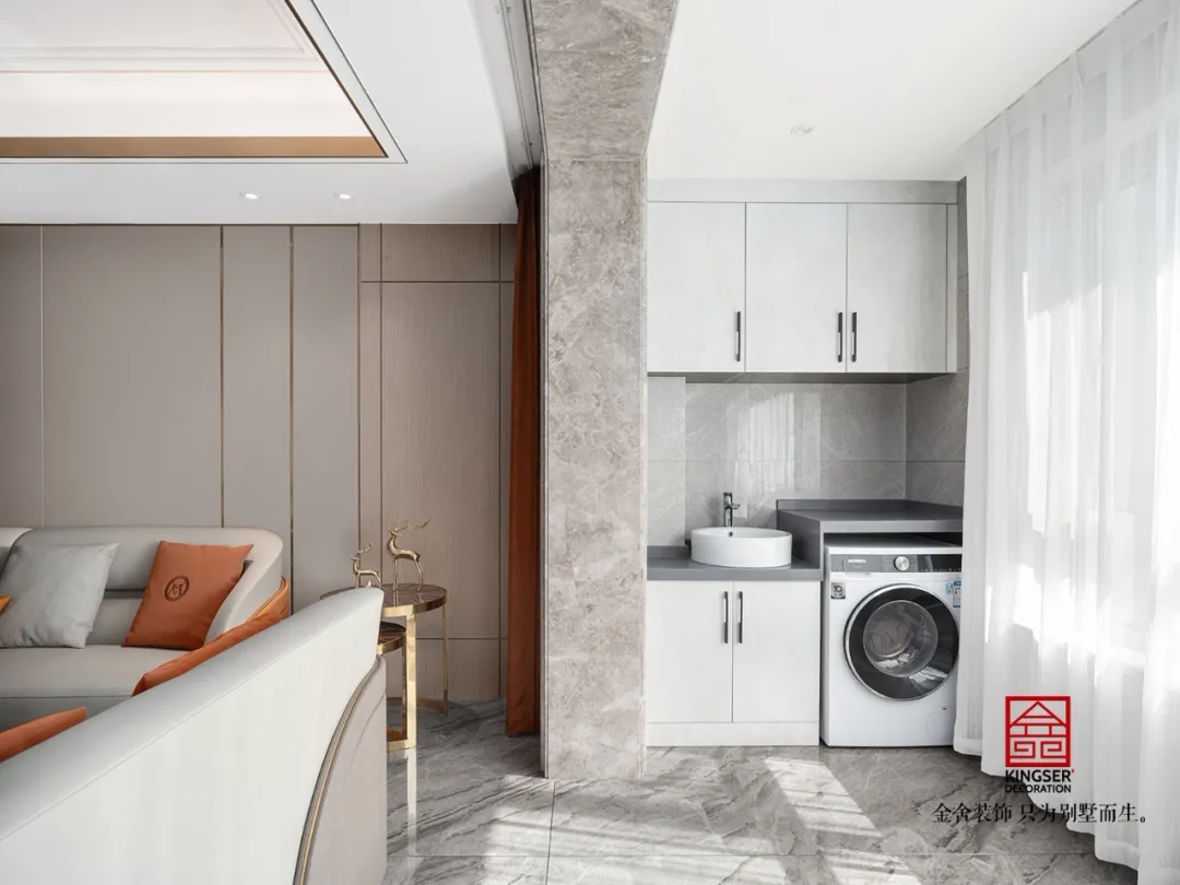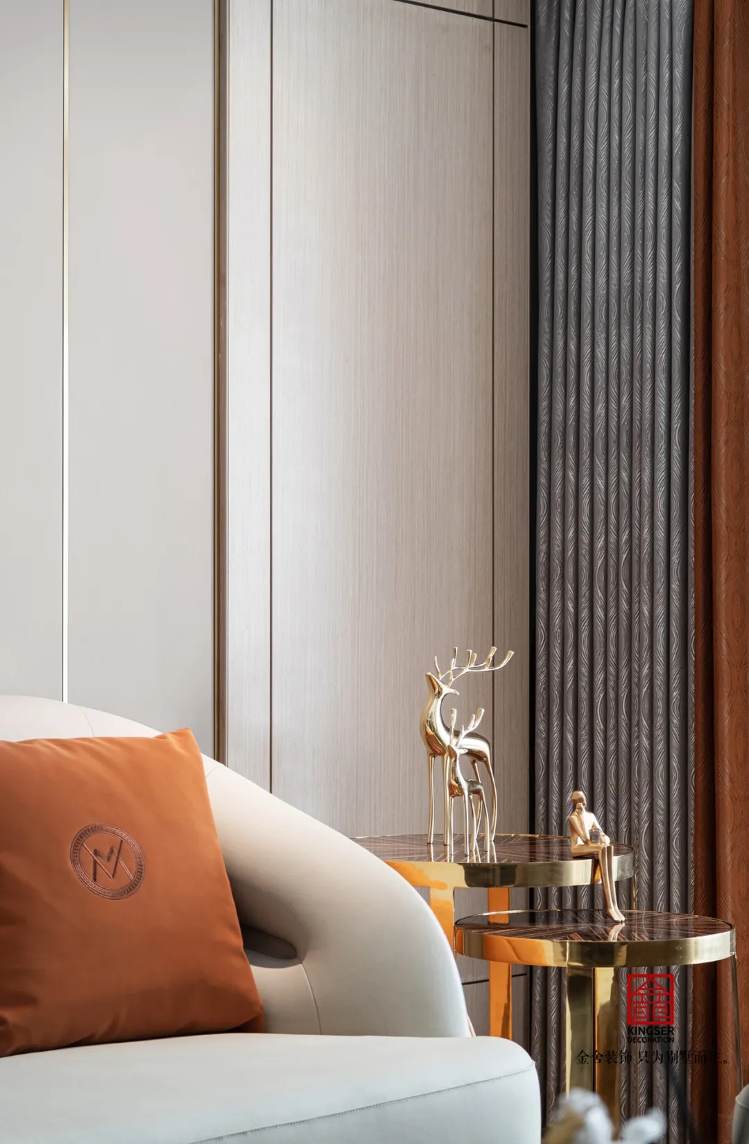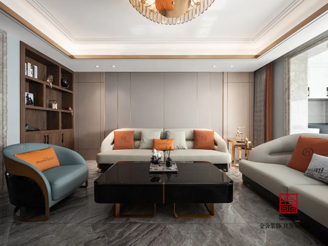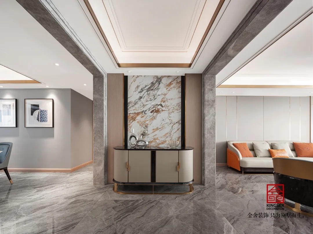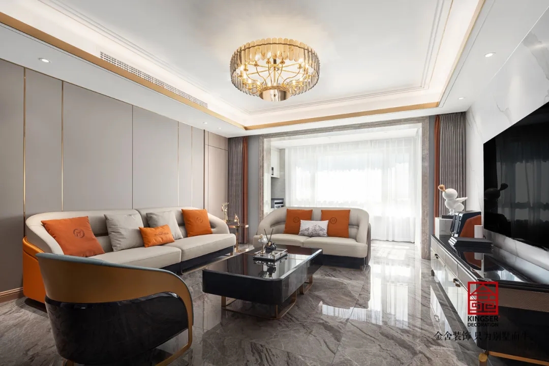 此案例為石家莊金舍裝飾-東南智匯城191平米輕奢風(fēng)格裝修實(shí)景。灰色寧?kù)o似夜,橙色活力迷人,優(yōu)雅低調(diào)的灰色,給人以夜的寧?kù)o,是包羅萬(wàn)象的,可以與任何顏色協(xié)調(diào)。橙色恰如冬日里的陽(yáng)光,可以是快樂(lè)愉悅的,又透出一絲深秋的憂傷。