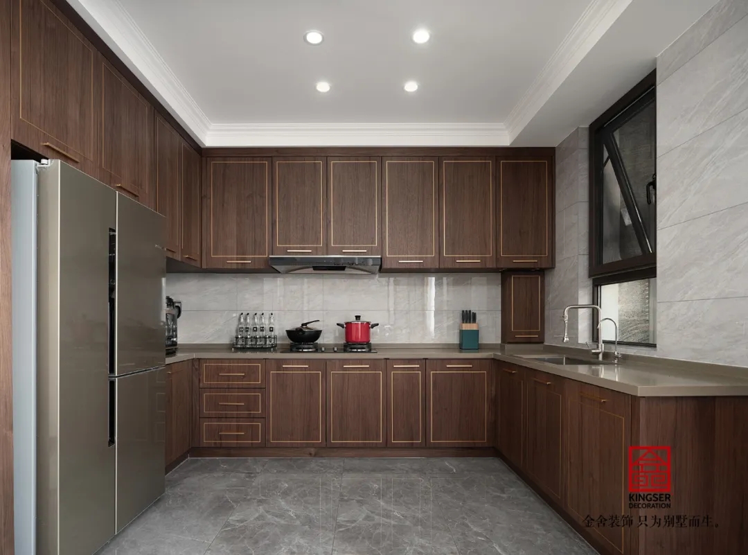 餐廳的圓形餐桌與方形吊頂相呼應,完美的嵌入了“方圓之間”的東方生活美學。既保留了原有頂面的高度又合理的劃分了空間,讓空間看起來更寬敞。餐廳背景墻的工筆花鳥更是提高了整個空間的靈動感,似在平淡的生活增加一份閑趣,讓家人在一飲一品之間感受生活的幸福。