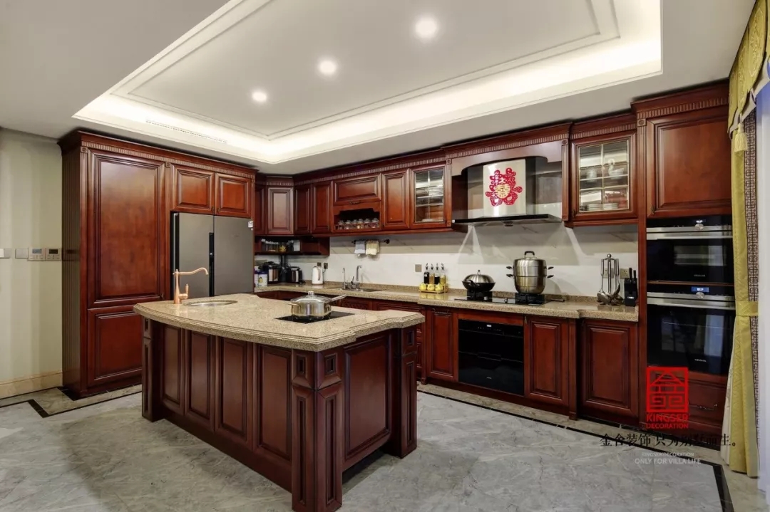 開放式廚房緊挨著以圓桌為主體的餐廳,中國人的傳統就是追求和和美美,用圓形的餐桌象征著團圓與和美。廚房的整體風格還是注重中式風格的廚房,只用中間出現的島臺才體現細節的差異。