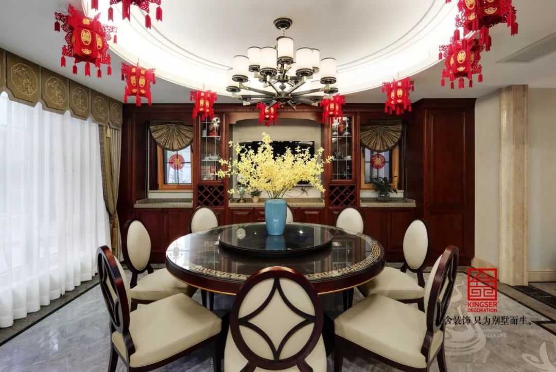 此案例為石家莊金舍裝飾-原河名墅600平米新中式風格裝修實景。沏一杯普洱茶生茶,摘一曲春華絲竹,一花合歡溫心志,是信手拈來的東方古意,竟也能驚艷兩個人的素常歲月。一組桌椅,一縷時光,一眾好友,于陽光深處,傾心布茶盞,笑談四季流轉,對飲山高云淡。