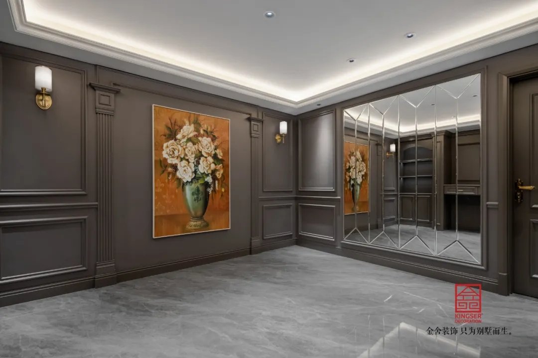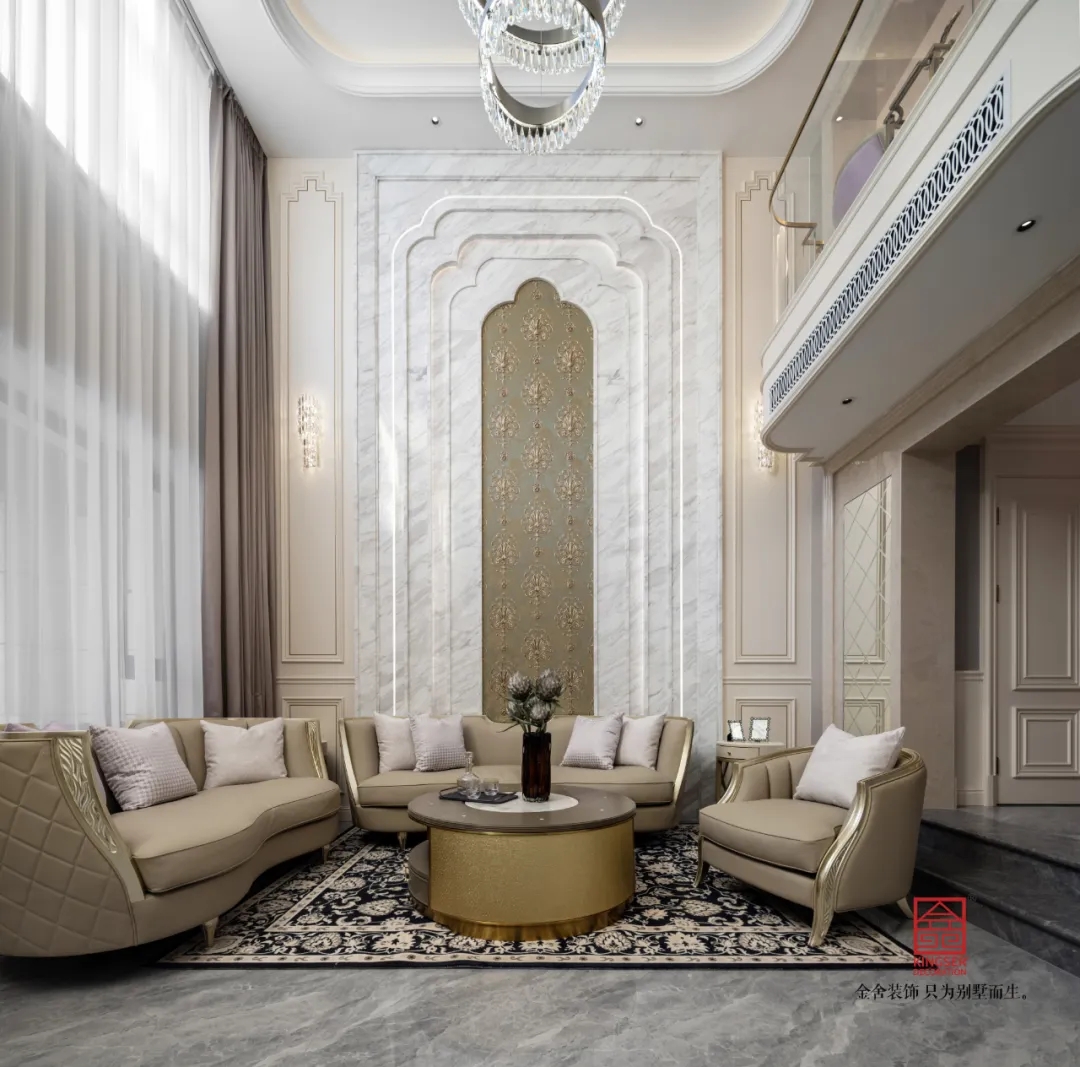一層客廳挑空的空間中,7米高的挑空設計拉高了整體的空間感,同時賦予了空間無盡的遐想。墻板的素雅與大理石的質感,宛如一幅細膩的畫卷,既有古典的韻味,又不失現代的簡約。大理石墻面的疊級設計,讓光線在墻面上流轉,為這個浪漫的空間增添了幾分神秘與詩意。