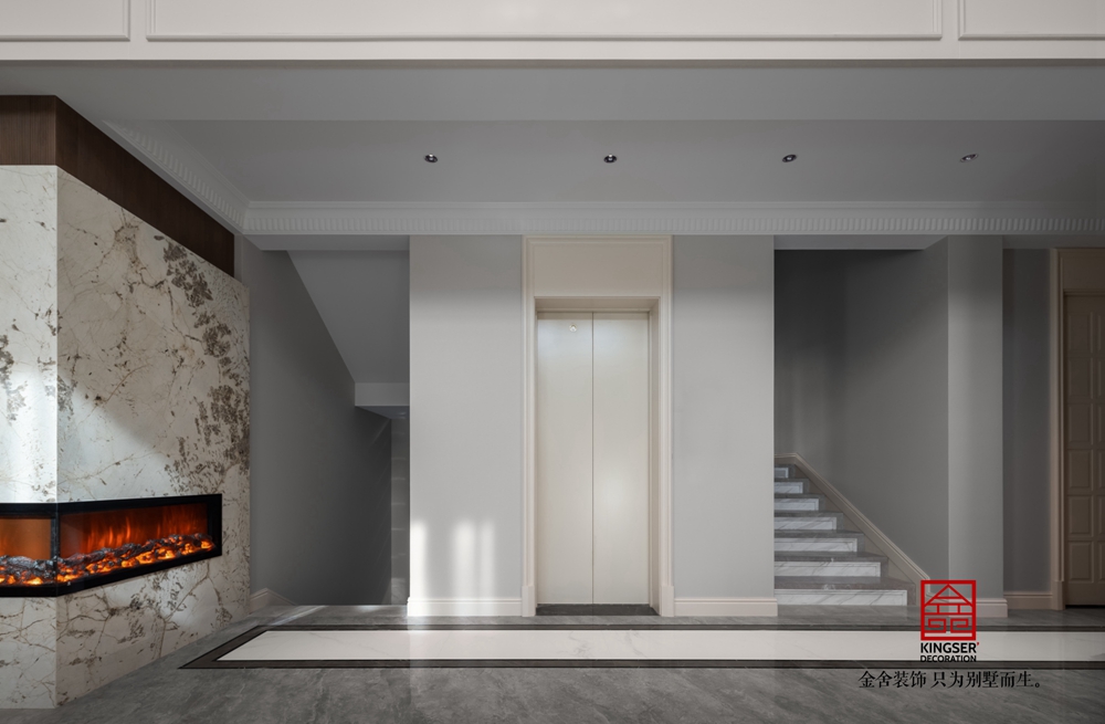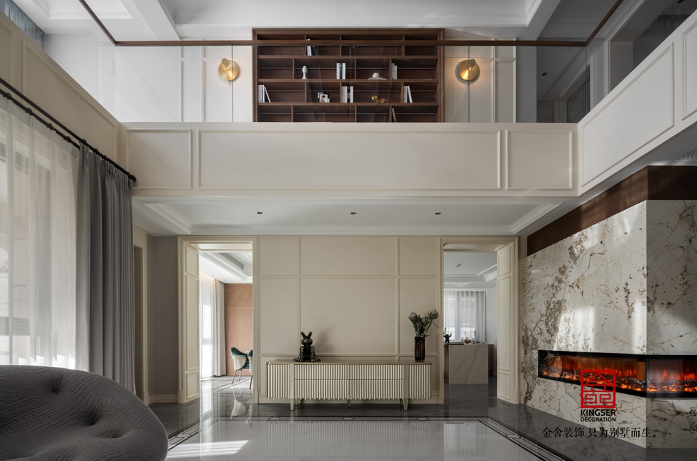 轉(zhuǎn)角壁爐的設(shè)計(jì)簡(jiǎn)約而不失優(yōu)雅,其獨(dú)特的造型與客廳的挑高設(shè)計(jì)相得益彰。壁爐的火焰在寒冷的季節(jié)里跳躍著,為整個(gè)空間帶來(lái)溫暖與生機(jī)。而素色沙發(fā)則以其純凈的色彩和舒適的觸感,為客廳增添了一份寧?kù)o與和諧。