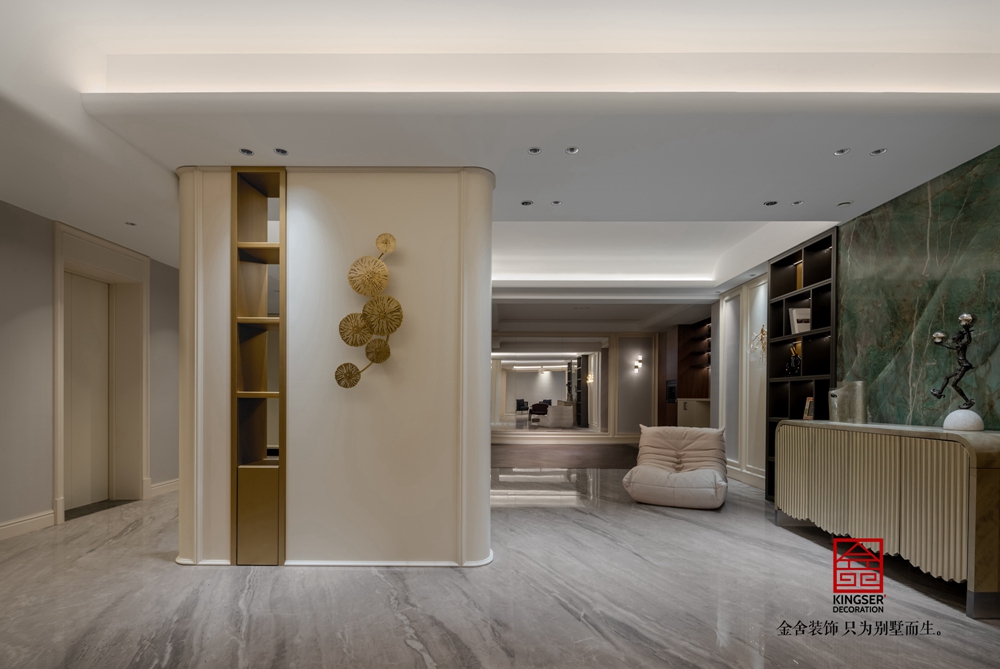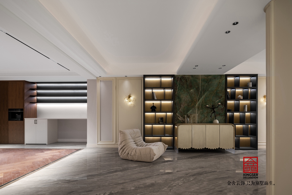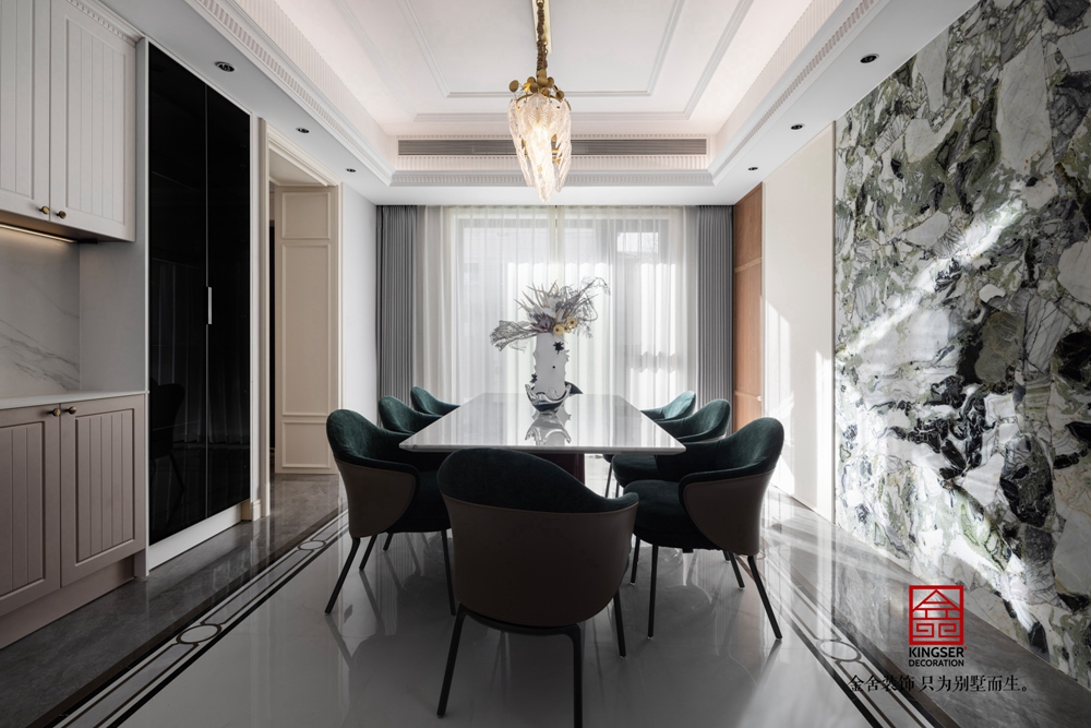 餐廳空間采用了透光奢石,這種材質(zhì)以其高貴的氣質(zhì)和獨(dú)特的紋理,為餐廚空間增添了一份奢華感。