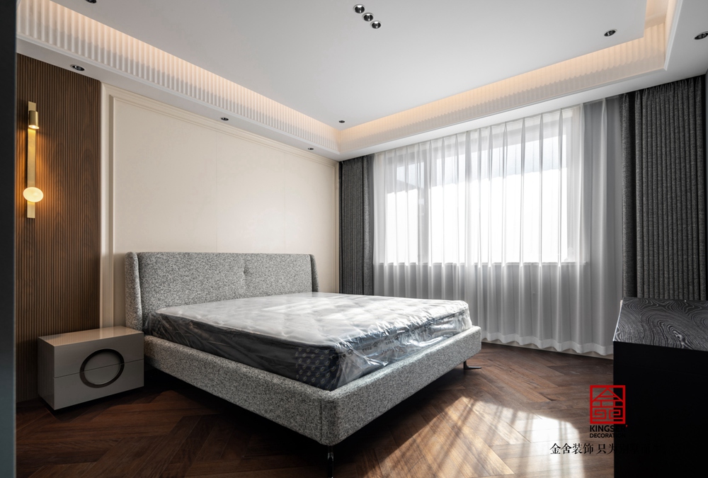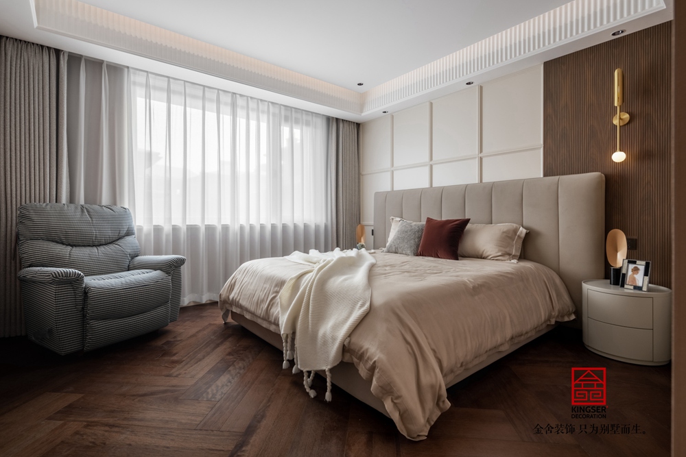 三層的空間就屬于完全的靜區(qū)了,除了一個(gè)三合一套間式的主臥之外還有一個(gè)書(shū)房。主臥完全采用深棕色木地板,吻戲而舒適,玻璃磚的設(shè)計(jì)保證了走廊的采光,將近四十平的臥室也給人一種氣派而美觀的感覺(jué)。