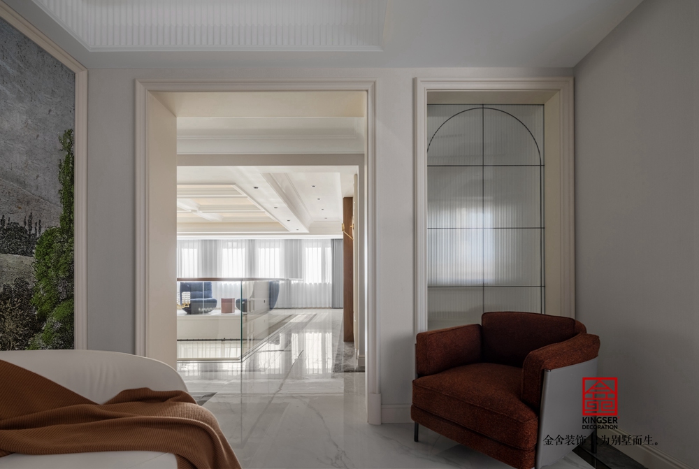 二層空間進(jìn)行了很大范圍的改動(dòng),在二樓專門搭出了一個(gè)休閑觀景區(qū),保證空間的完美利用的同時(shí),又給人一處放松的空間。同時(shí)將一個(gè)臥室改成了書(shū)房,透明隔墻的處理,增加空間采光,也是為了孩子們有一個(gè)很好的閱讀上網(wǎng)的空間。