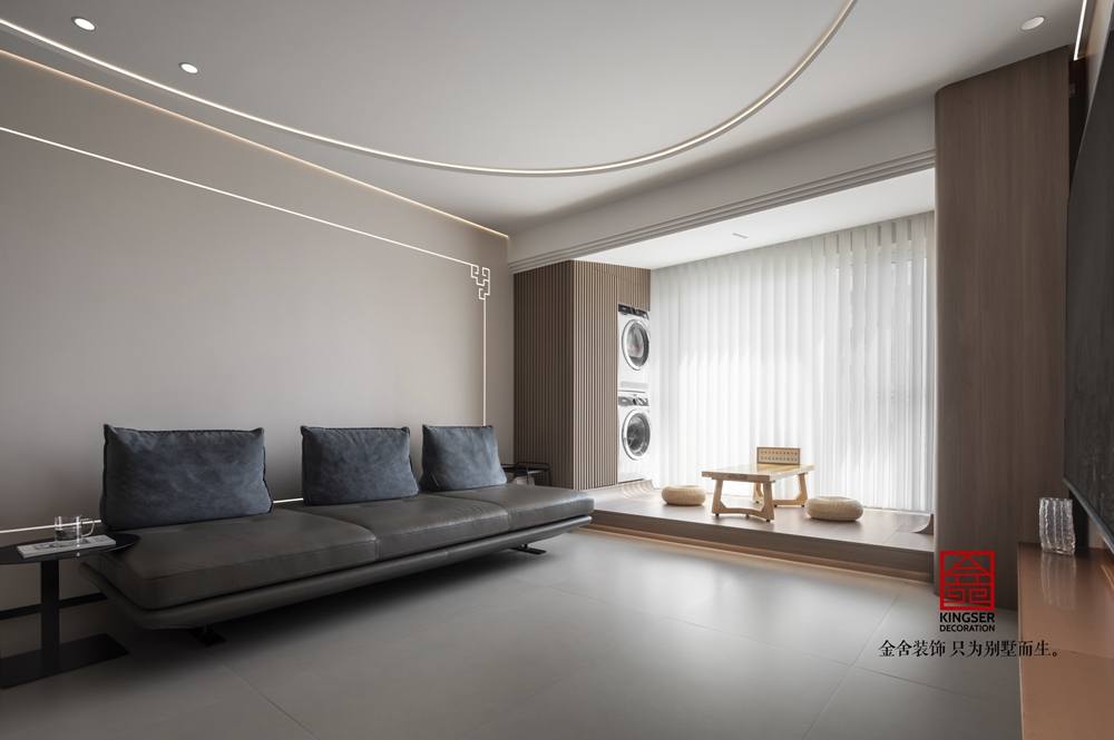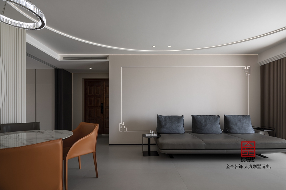 客廳空間沒有安置茶幾,這種無茶幾的設計 ,讓整個空間看起來更加的寬敞,本身就是一家五口,這樣的設置,也給了孩子足夠的運動空間,沙發背景墻用燈條拼接而成,中式紋理的也被制作了進去,讓整個空間充滿文化的氣息。