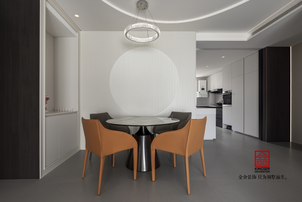 餐廳在這個空間中是中間的位置,于是用格柵板做出一個聚寶盆的形狀,不同的視野下會顯示出不同的效果。同樣也寓意著順風順水,財氣皆來。圓形的餐桌,圓形的吊燈,圓形的造型,突出中國人向往團圓的美好意味。