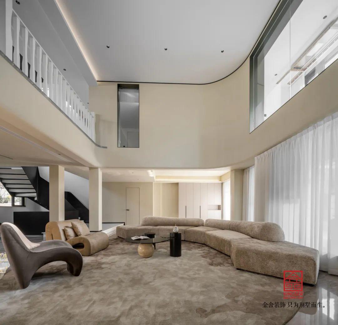 巨大的挑空空間之下,是設計師對于設計的把控,首層6米挑空客廳以鋼化玻璃幕墻打造通透感,雙層中空玻璃引入充沛自然光,半開放的廚房、島臺吧臺與落地窗景融為一體。全屋采用暖白、卡其、米咖等低飽和色調(diào),墻面啞光質(zhì)感涂料與淺咖沙發(fā)碰撞,塑造出極具質(zhì)感的空間。