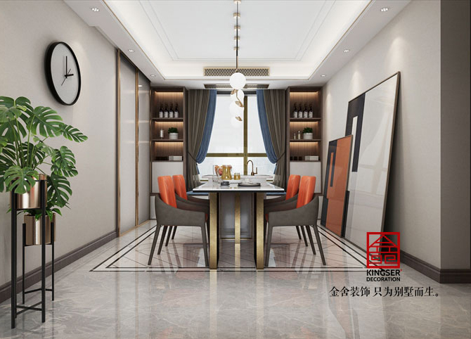 客廳造型別致的幾何茶幾組合與暖橙色單人沙發的搭配,讓空間在低調的氛圍中滋生少許精致的美感。餐廳是客廳美感的延續,島臺與餐桌的結合讓空間更飽滿,功能性也進一步提升。黑白對比分明的色調,凸顯高級質感。極簡的吊燈帶來的不僅是明亮的光線,更是生活中不可缺失的小情調。