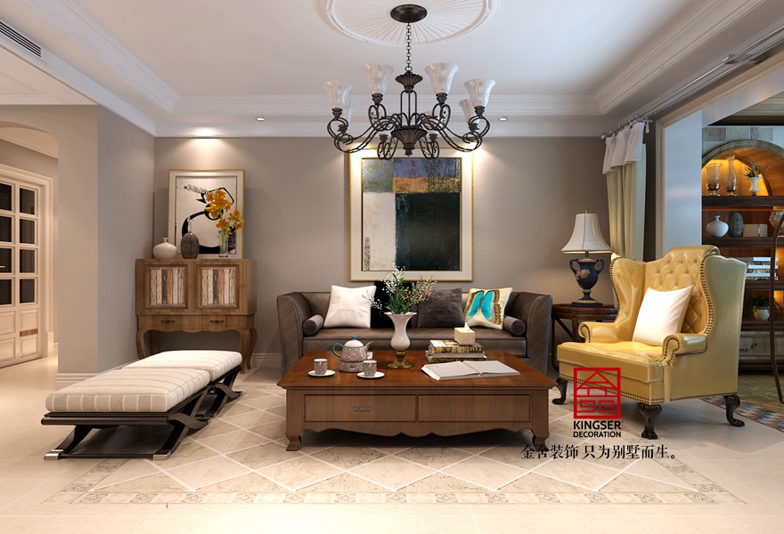 本案以高級灰色調為主,大面積運用了木布結合的家具,空間彌漫著回歸自然的氣息,體現了主人追求精致生活的同時,也不乏內斂的氣質。入戶客廳的磨弧埡口,讓人很舒服又有眼前一亮的感覺,也使整個空間多了一絲靈動,頗有活潑的意味,也與走廊盡頭的玄關遙相呼應,有著密不可分的關系。正是這種灰色系的應用配以地面暖色的精美拼花地磚,空間很好的劃分,又讓整個空間對比鮮明,瞬間變得圣潔起來。