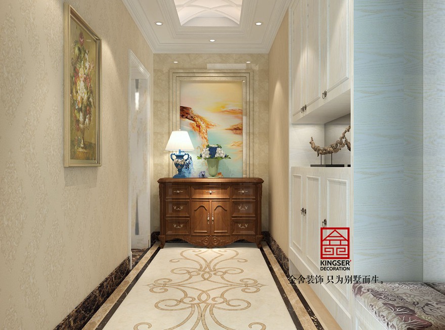 設計說明:此案例為石家莊金舍裝飾-原河名墅400平米歐式風格裝修效果圖。沒有純歐式的繁亂,客廳與臥室的對比繁簡統一,讓人心情平靜。椅子藍色皮質與臥室藍色布藝相輝映,使之更為整體。束花裝飾點綴及綠植擺設使整個空間更加清新田園。田園氣息讓人在忙碌的都市多了份愜意和滿足。金屬材質以及水晶吊燈讓整個空間更為時尚、大氣。真正做到了大氣而又內容。