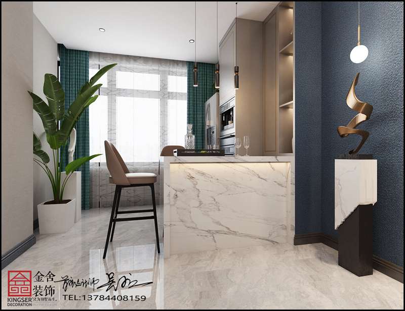 本方案設(shè)計的最大亮點(diǎn)在于餐廳和西廚銜接的吧臺位置,把北陽臺和餐廳打通,顯得空間感十足,視覺上通透,在生活中實(shí)用性更強(qiáng)。