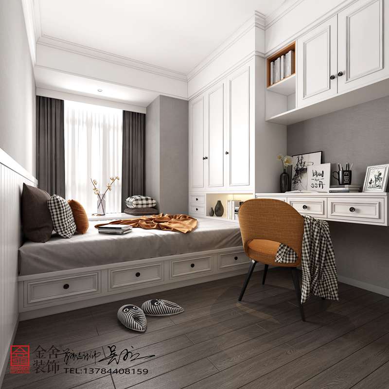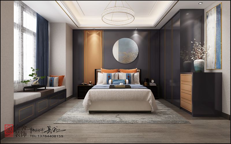 設(shè)計方案中輕奢新中式風(fēng)格臥室的色彩設(shè)計受現(xiàn)代繪畫流派思潮影響很大。通過強(qiáng)調(diào)原色之間的對比協(xié)調(diào)來追求一種具有普遍意義的永恒。