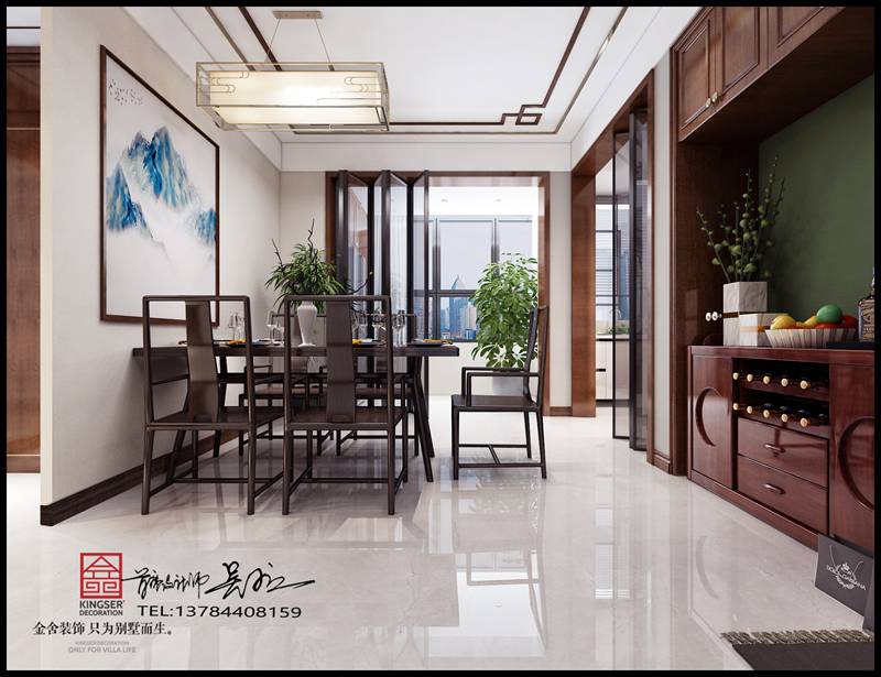 本方案為石家莊金舍裝飾-榮盛華府178平米新中式風格裝修效果圖。風格為新中式,倦鳥歸林,魚翔淺底,落葉歸根,這都是對