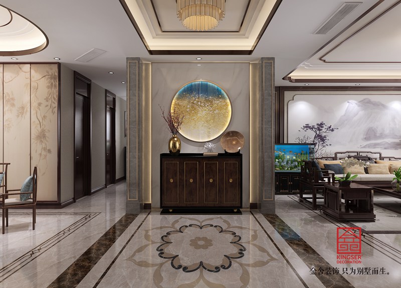 設計說明:此案為石家莊金舍裝飾-榮盛華府200平米中式風格裝修效果圖。本案采用了現代的設計語言來表達東方的意境,用新中式風格打造出蘊含禪意的家居空間,隱去傳統中式繁雜的設計表現,用減法來表達東方元素。