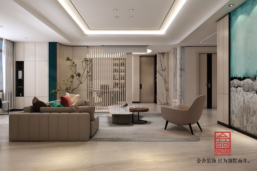 石家莊金舍裝飾-榮盛華府205平米現代風格裝修效果圖。此方案的風格傾向定位于現代風格。業主崇尚清新時尚的現代風格。通過與業主的深入溝通,本著輕裝修,重裝飾的原則,同時圍繞著業主對房子功能的要求,合理的對空間進行了改造與工能劃分。本案的設計重點是會客空間與門廳、餐廳以及過道空間互通與交流,從設計手法上采用了從墻面上的線與面銜接呼應,以及頂面的空間的虛擬劃分。墻漆、壁紙與家具配飾的使用,使空間更加豐富與溫馨。達到各功能空間融匯貫通的目的。成熟細致的線條結合家具與軟裝,烘托內斂優雅的大宅風范。開放式廚房,增加了家庭的互動性。