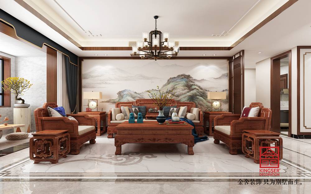 客餐廳空間添加了中式山水畫祥云圖案元素,使整體空間感覺更加豐富,大而不空、厚而不重,有格調(diào)又不顯壓抑