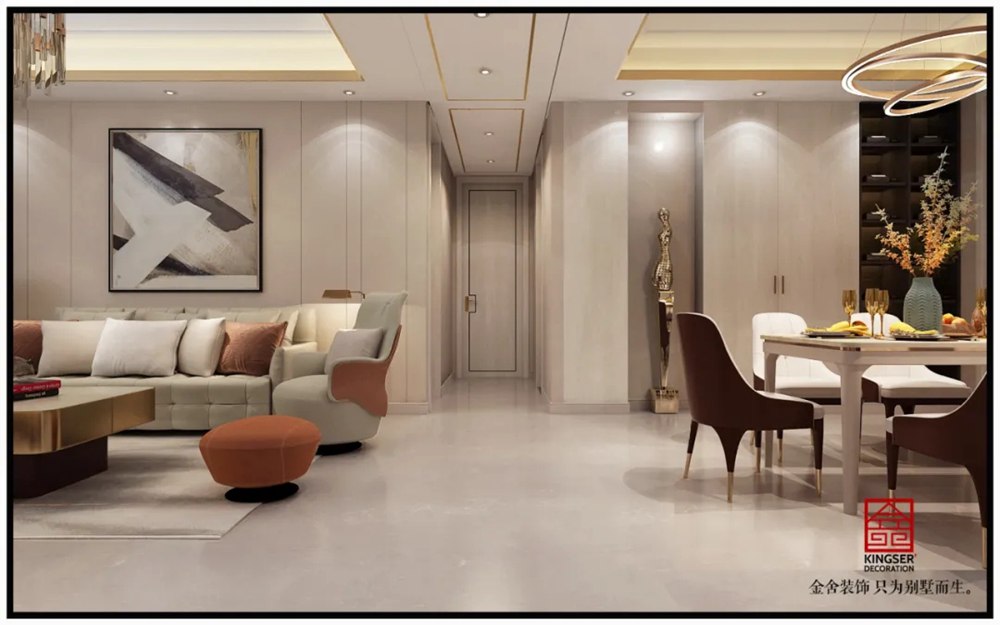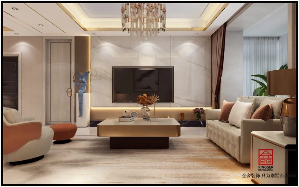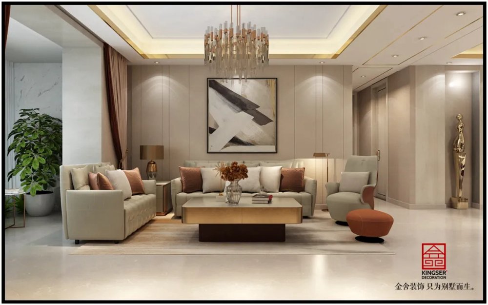 此案例為石家莊金舍裝飾-瀚林甲第166平米輕奢風格裝修案例。一縷和煦的陽光,照亮你的家。木色與大理石,不僅能襯托陽光的溫暖,在視覺上還有較強的延展性,相同色系的墻壁將整個家居空間合為一個統一整體,帶給居住者不一樣的視覺享受。