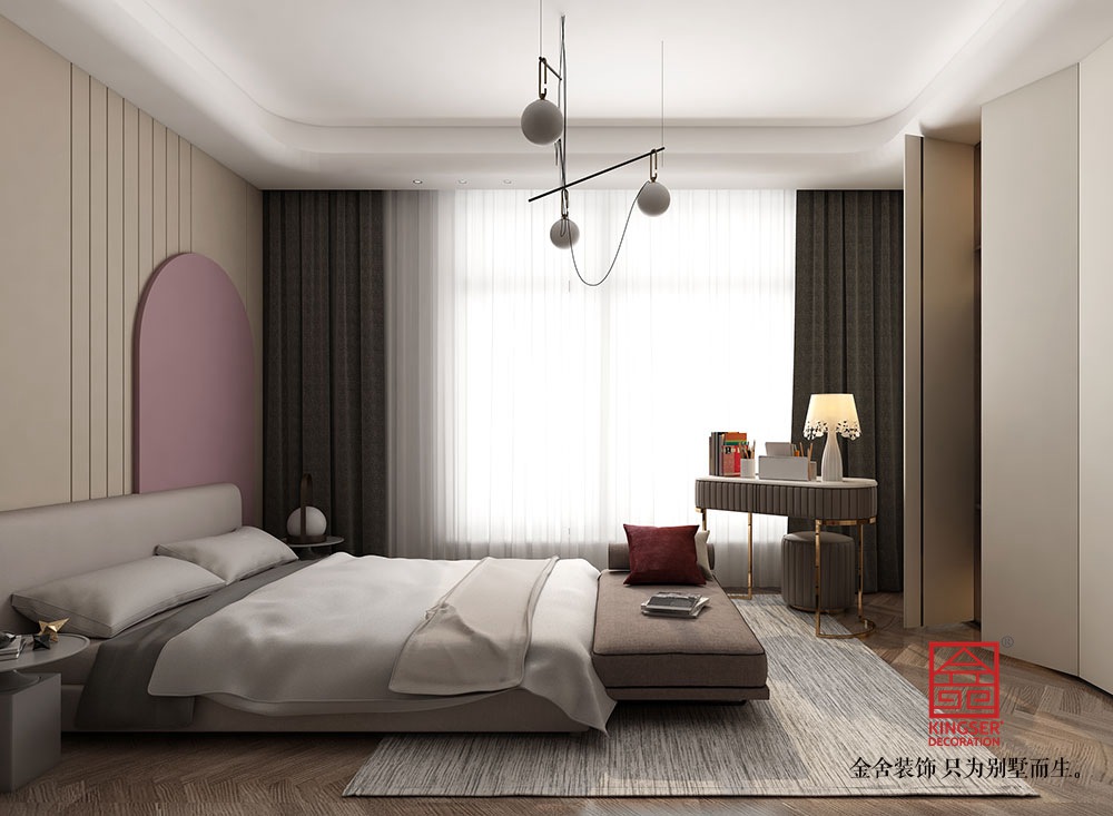 主人喜喝茶、對影音方面有需求、社交圈廣、對客餐廳和廚房要求極高,設計師進行了適當的墻體拆除,利用梁去做造型,去強化、體現空間感。客廳利用柱子做了一個東西向的書柜,具備一定的空間實用性。加入透光玻璃使其增加采光面,把人造光打造成自然光的感覺,以達到光的營造目的。電視墻的處理手法是把實墻的底部設計懸空感,讓實墻變成裝置、底部下面放石頭,石頭與不銹鋼飾面和反弧度造型有很好的銜接。頂面直接用雙層弧面頂、上下弧形完美銜接,給人一種輕盈感。投影與書房的銜接,燈光是周圈燈光,光感也會框定化、面也會最大化,形成等面。留白不空,留白不白,濃淡得宜,猶如山水畫般更能予人無限想象的空間。廚房整體的構造是開放式設計,不僅具有較強的流動性和自由性,同時有保持空間的功能合理性打造更加人性化的烹飪環境。臥室是人在家中憩息的港灣,倦鳥歸,整體營造的沉穩、安靜、高端的風,使視覺以及精神感知方面得到雙重享受。