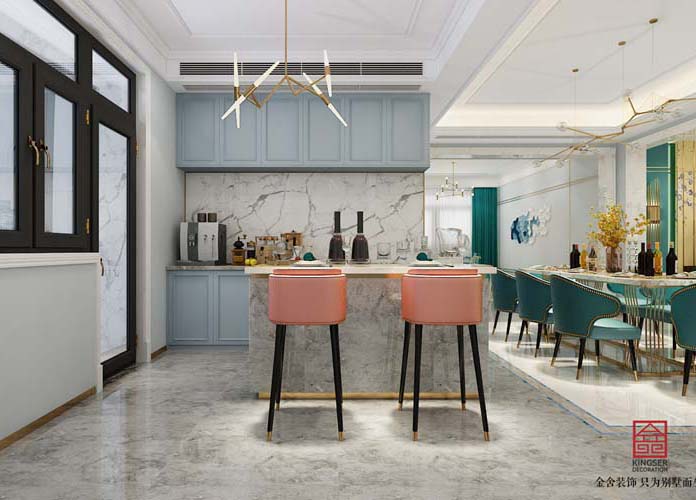 設計說明:此案例為石家莊金舍裝飾-林蔭大院260平米輕奢風格裝修效果圖。設計之美不應全倚仗修飾,而應該醉在靈魂。金屬的高貴冷感,更易與小物件和小細節催生出默契,精致的輕奢氣質點睛而出。