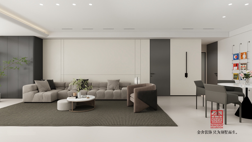 本設(shè)計(jì)案例展現(xiàn)了一個(gè)集現(xiàn)代美學(xué)與實(shí)用性于一體的客廳空間,完美詮釋了金舍裝飾對(duì)于高品質(zhì)家居生活的追求與承諾。整體設(shè)計(jì)圍繞“簡(jiǎn)約而不簡(jiǎn)單”的理念,旨在打造一個(gè)既舒適又富有格調(diào)的居家環(huán)境。