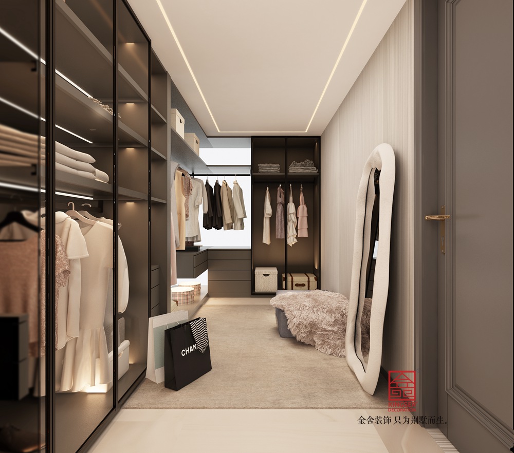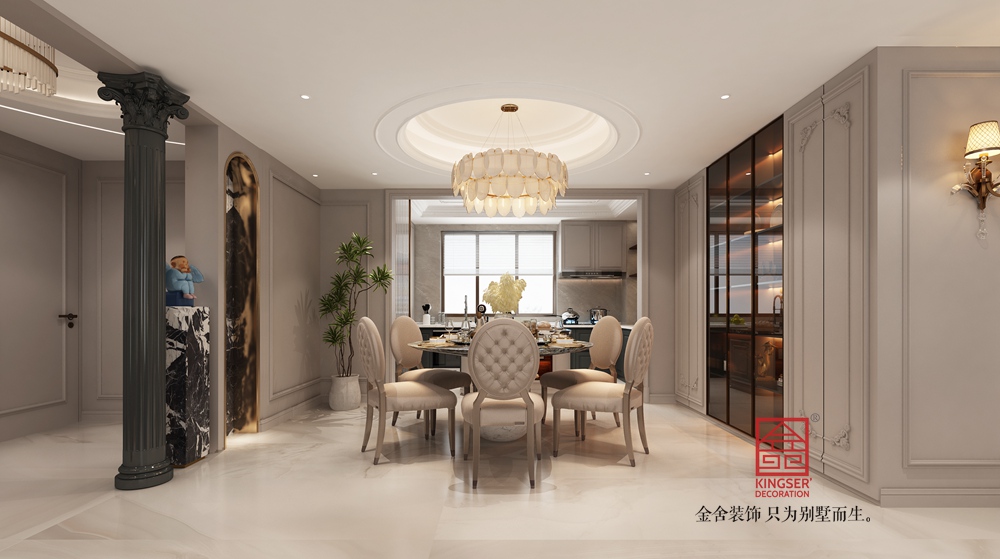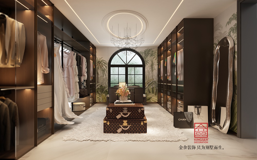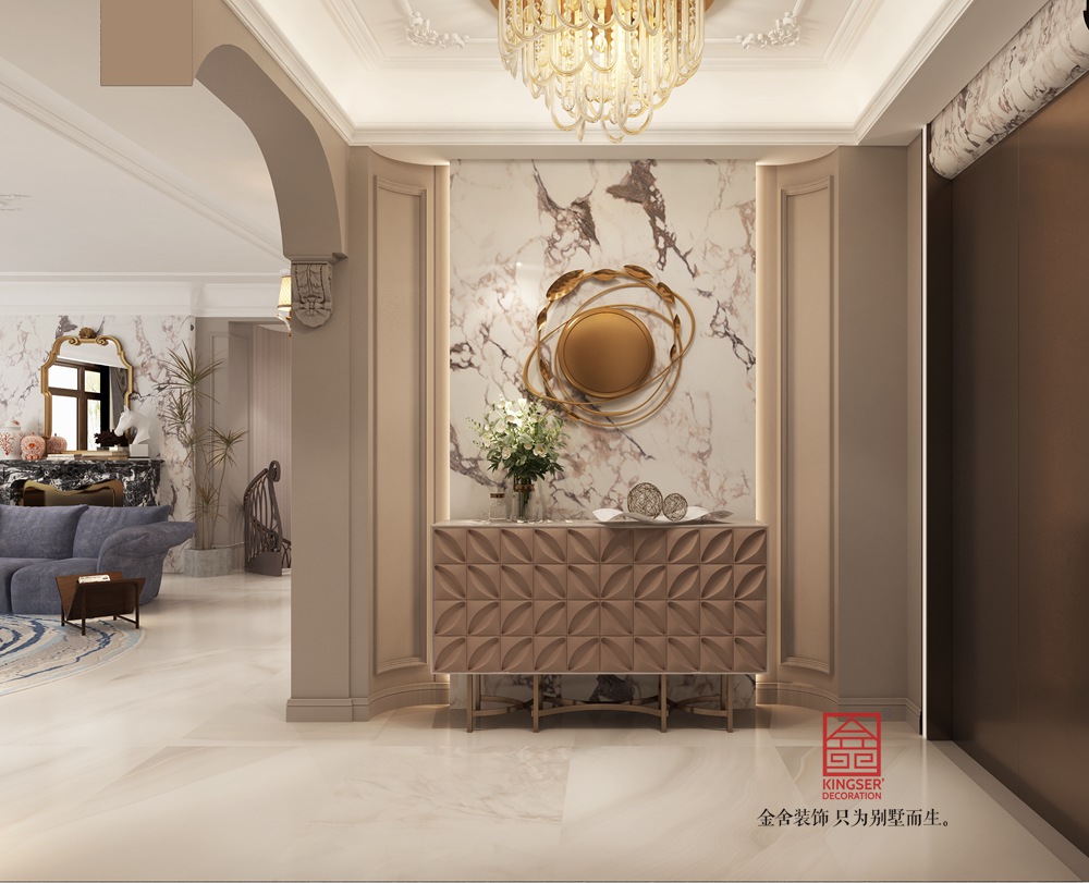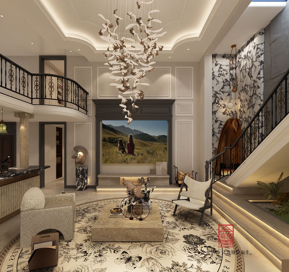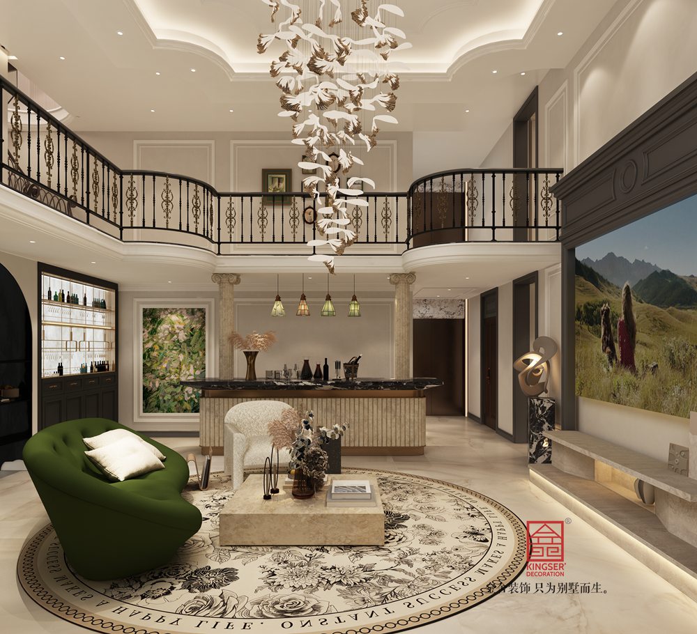 本案挑空客廳以新古典風格為基底,融合現(xiàn)代設計語言。運用經(jīng)典的石膏線、護墻板勾勒空間秩序,搭配簡約造型的家具與藝術(shù)吊燈,既保留古典的優(yōu)雅韻味,又注入當代的時尚與靈動,實現(xiàn)傳統(tǒng)與現(xiàn)代的對話。