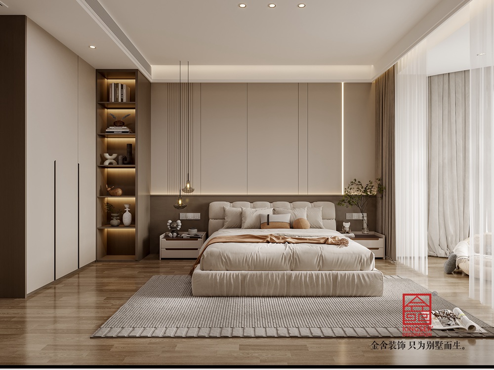 該別墅客廳設(shè)計(jì)遵循現(xiàn)代輕奢與極簡(jiǎn)融合的思路。整體色調(diào)選取低飽和度的暖棕、米白等,構(gòu)建出雅致柔和的基底。大面積的墻面采用簡(jiǎn)潔的板材設(shè)計(jì),干凈利落,與嵌入其中的電視及兩側(cè)帶有燈光點(diǎn)綴的收納格相配合,既滿足實(shí)用需求,又通過(guò)光影變化營(yíng)造出輕奢氛圍。