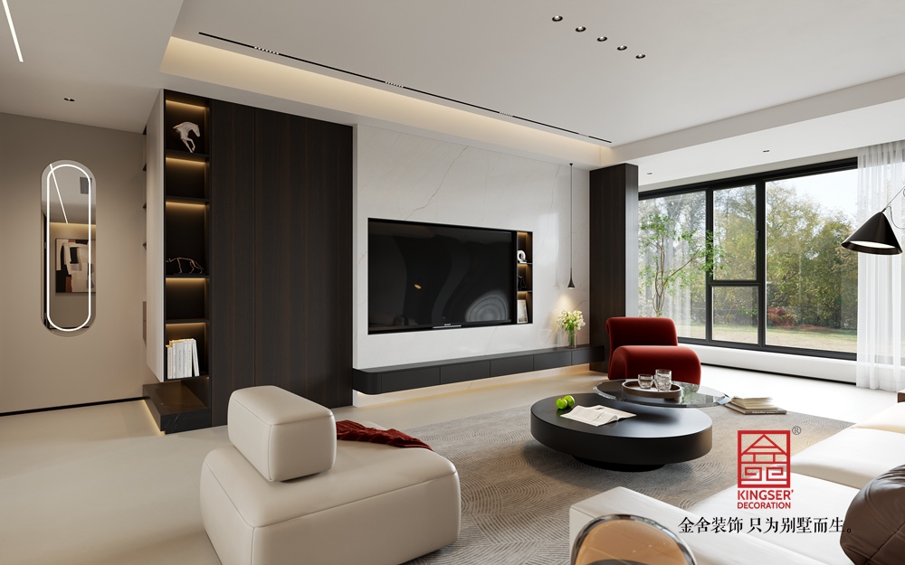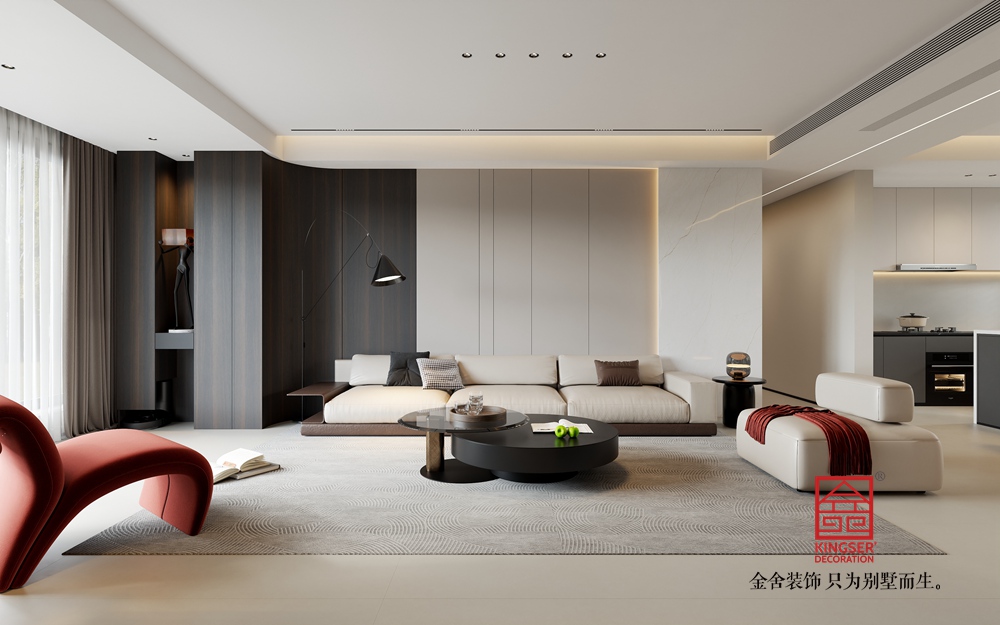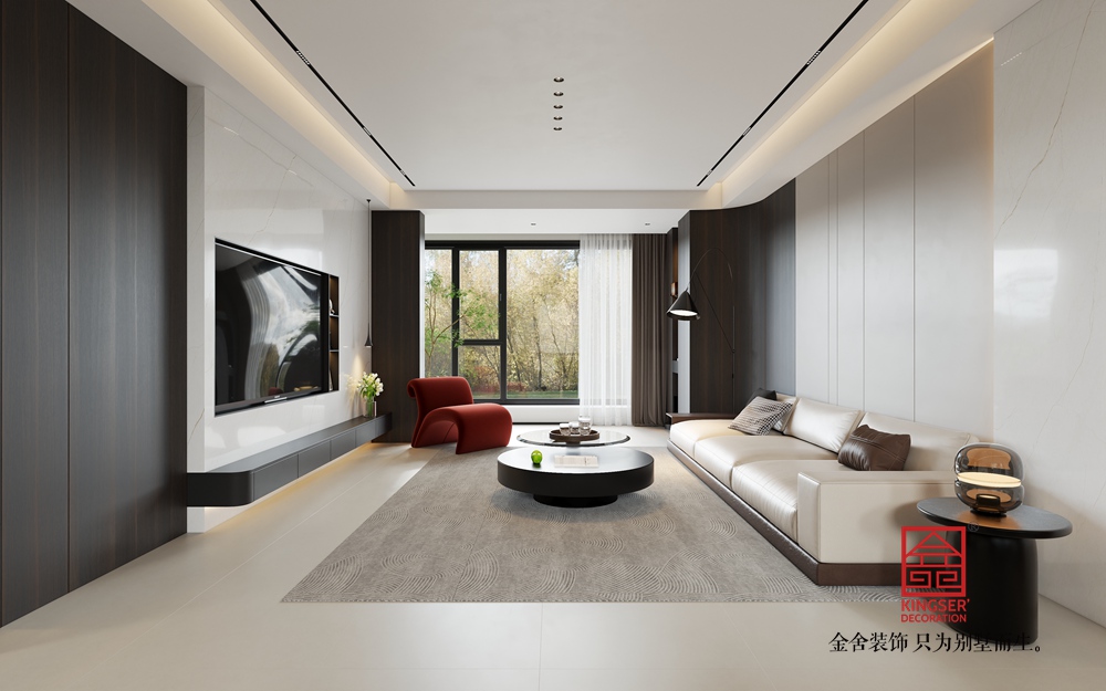 該客廳設(shè)計(jì)緊扣意式輕奢的風(fēng)格。空間以柔和的淺色系為基底,搭配深色木質(zhì)元素,營(yíng)造出平衡且有質(zhì)感的視覺(jué)效果。
