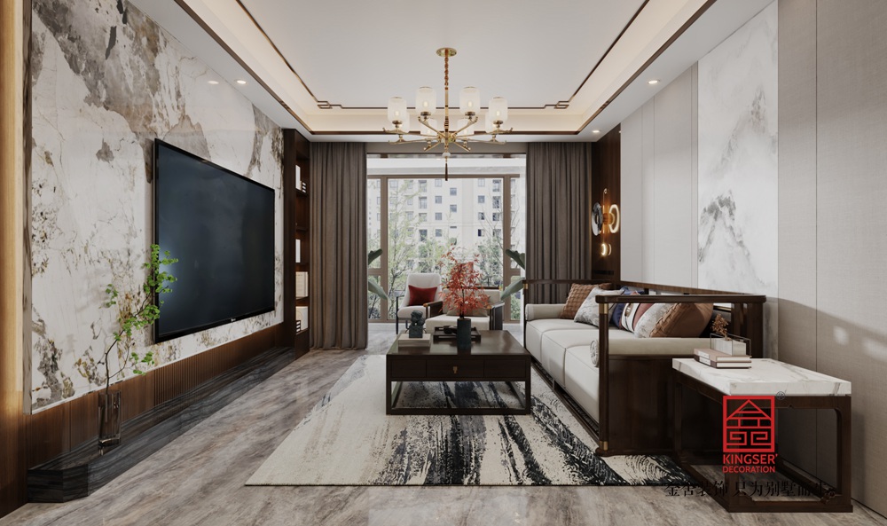 家具造型汲取中式傳統(tǒng)形制精髓,線條簡潔流暢,實木框架搭配軟包,既保留古樸韻味,又具現(xiàn)代舒適感。墻面的山水紋理裝飾、精致的中式吊燈,以及茶幾上的瓷器擺件,處處彰顯中式美學的雅致。